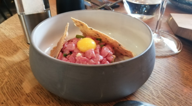 Suomessa viime vuosina olleen, ja nyt jo vähän hiljentyneen, tartarbuumin aikana näitä on tullut syötyä aika monenlaista. Jahun versio tartarista oli perinteinen. Luomuliha oli tässä annoksessa kohdallaan ja maku oli hyvä. Ravintola kertoo panostavansa luomuun, mutta alkuruoan kanssa joimme Itävaltalaista Gruner Veltlineriä, joka siis ei ollut orgaanista, mutta muuten erinomaista.
