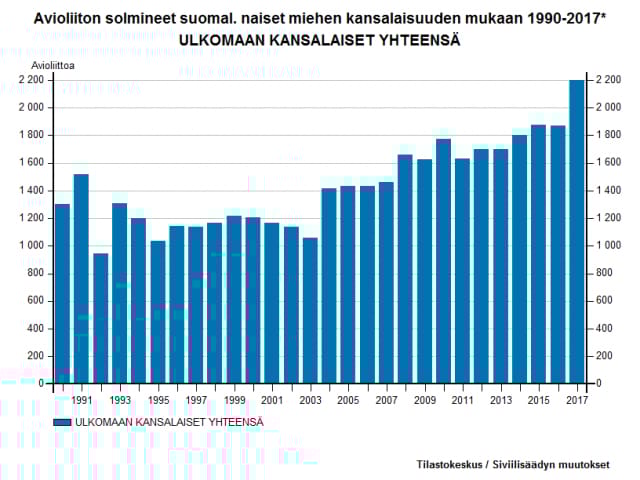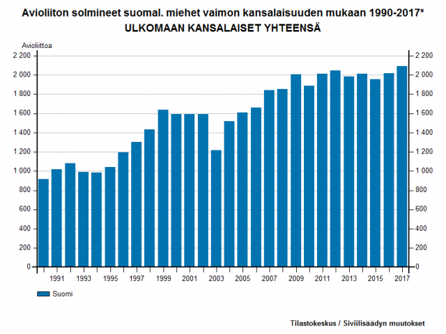 Kaiken kaikkiaan Suomessa solmittiin vuonna 2017 yhteensä 26 542 avioliittoa, eli noin 16 % kaikista solmituista avioliitoista tapahtui ulkomaalaisen kanssa.