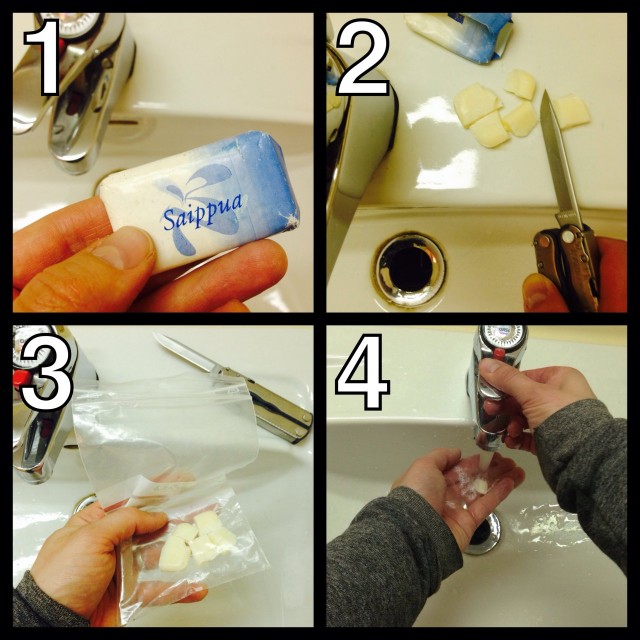 Sinun ei tarvitse käyttää kerralla koko saippuaa, jos paloittelet saippuan useampaan osaan. Laita palat vaikkapa Minigrip-pussiin, ja käytä yksi kerrallaan.