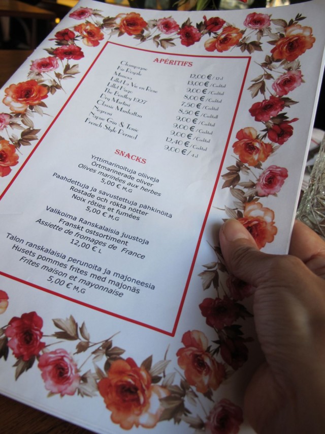 Ravintolan edessä on mukavan kokoinen terassi, johon paistaa ilta-aurinko. Vaikka terassi on vilkkaasti liikennöidyn Mannerheiminkadun varrella, on etäisyyttä katuun sen verran, että terassilla näyttävät viihtyvän myös ruokailijat. Ravintolan sisälle liikenne ei kuulu paksujen kiviseinien ansiosta lainkaan ja taustalla vaimeasti soiva ranskalainen musiikki luo juuri oikeanlaisen tunnelman.