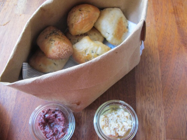 Pöytään kiikutetaan söpö pussukka talon leipää hummuksen ja tapenaden kera. Tapenade ei ole liian suolaista, hummus tuoretta ja leipä maukasta. Tarjoilija kertoo, että leivän koostumus vaihtuu sen mukaan kuka on keittiössä. Nyt tarjolla on mukavan sitkoa leipää, jonka päällä on seesaminsiemeniä. Hyvää!