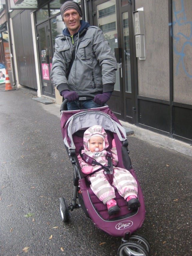 Otan ne vaatteet mitkä ekana käteen osuu vaatekaapista. Vaimo päättää ja ohjeistaa pukeutumisessa. Lasten vaatteet ovat tosi kivoja ja Lottaa on kiva pukea värikkäisiin vaatteisiin. Toisinaan pukeudumme sävysävyyn. Tänään valitsin harmaan takin ja lilat sormikkaat, samat värit toistuvat Lotan rattaissa.