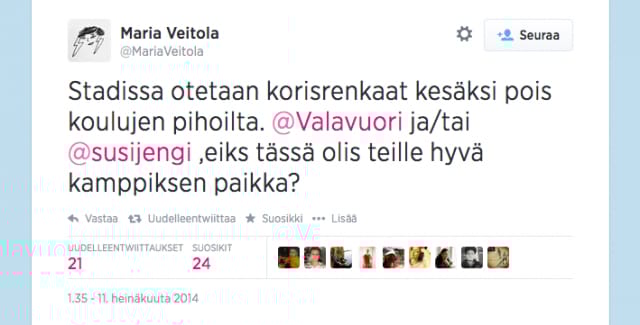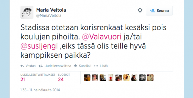 Radio Helsingin päätoimittaja[b] Maria Veitola[/b] esitti saman kysymyksen [url=https://twitter.com/MariaVeitola/status/487515469335638016]hetki sitten Twitterissä[/url]. Keskusteluun ajautuneet urheilun puolustajat [b]Aleksi Valavuori[/b] etunenässä lupasivat tehdä asialle jotain. Asiasta on käyty keskustelua jo aiemmin myös kaupungin suuntaan, mutta kaupunki ei ole reagoinut. Kaupungin pampuista [b]Pekka Sauri[/b] otti osaa Veitolan Twitter-ketjuun ja lupasi viedä asiaa eteenpäin.