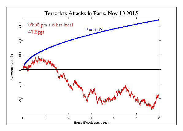 Tietenkin voit olla skeptinen koko asiasta, ja mieluummin piereskellä sohvallasi katsellen hömppää televisiosta. Siihen Sinulla on täysi oikeus. Mutta älä silloin luule ymmärtäväsi mitään siitä, mikä vaikuttaa ihmisiin tehokkaimmin. Alla voit esimerkiksi tutustua Global Consciouss Projectin dataan kahden tapahtuman osalta, jossa ylöspäin etenevä käyrä osoittaa positiivista kollektiivista tietoisuuden koherenssia (tunnetilana ja [B]intentiona[/B] rauha, rakkaus, tasapaino, empatia yms) ja alempi hajaannusta (ja sanoisin, että tuossa Pariisin tapauksessa kuvastaa pelkoa, levottomuutta yms).