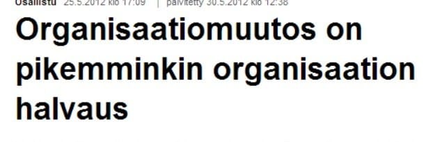 Toisaalta Suomessa huonona esimerkkinä toimii Nokia, jossa [url=http://yle.fi/uutiset/organisaatiomuutos_on_pikemminkin_organisaation_halvaus/6135744]organisaatiomuutos[/url] on ollut arkipäivää. Uutta organisaatiota ei olle aina ehditty saattaa päätökseen, kun jo uusi organisaatiomuutos on julkistettu. Henkilö joka on työskennellyt Nokialla 10 vuotta on keskimäärin kokenut 7 organisaatiomuutosta! Aina muutos ei ole ollut edes kunnolla huomattava – työkaverit, vastuut ja pomo ovat pysyneet samana – mutta toisinaan muutoksessa kaikki palaset ovat liikkuneet ja työtehtävät ovat olleet huomattavan erilaiset aiempaan verrattuna. Alle vuoden kestäneessä organisaatiorakenteessa eivät vastuiden vaihtumisen kokeneet työntekijät ole päässeet kunnolla sinuiksi työnsä ja sidosryhmiensä kanssa kun jo uusi muutos on tuloillaan.