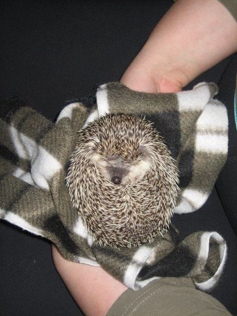Hamlet oli aika sähäkkä siili meille tullessaan. Haimme siilin viralliselta kasvattajalta, toimme pahvilaatikossa pehmoisiin fleeceihin sammuneena ja kotona se sai hirveän tuhinahepulin. Kuin vihainen höyryveturi olisi tuotu kotiin, piikkeineen kaikkineen. Vaikka olin yrittänyt totuttaa sitä hajuuni pitämällä yhtä sen fleeceistä ihoani vasten, Hamlet ei kovinkaan arvostanut paikanvaihdosta. Meni monta viikkoa, ennen kuin se alkoi luottaa minuun. Ei ehkä helpoin yksilö aloittelijalle.
