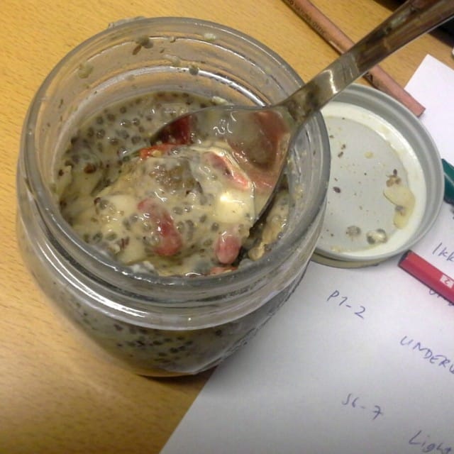 Aamu-unisena olen tällä viikolla tehnyt tuorepuuroni pieneen lasipurkkiin, jonka voin ottaa mukaani työpaikalle. Aamun oppituntien jälkeen lusikoin puuroni sitten työkoneen ääressä ja juon aamukahvit päälle. Tuorepuuro on runsaskuituista ja täynnä hyviä hiilihydraatteja ja proteiinia, ja se pitää nälän pois loistavasti lounasaikaan asti. Energiapitoisemman puuron saa, kun käyttää siihen pelkkien hiutaleiden ja siemenien lisäksi kuivattuja hedelmiä ja rusinoita.