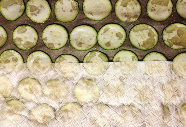 Laita uuni lämpenemään 150 asteeseen. Suihkauta öljyä leivinpaperoidulle uunipellille (tai levitä öljy pullasudilla tms.) ja asettele noin millin paksuiset kesäkurpitsaviipaleet pellille. Itse asettelen ne säntillisesti riveihin, jotteivät ne mene yhtään päällekkäin. Ei siihen kauaa mene, ja tulos on paaaaljon parempi! Painele viipaleita hieman talouspaperilla, jotta saat ylimääräisen nesteen viipaleista pois. Ripottele mausteet päälle. Suolan kanssa kannattaa olla varovainen – helppo sitä on lisätä mutta koitappas poistaa?