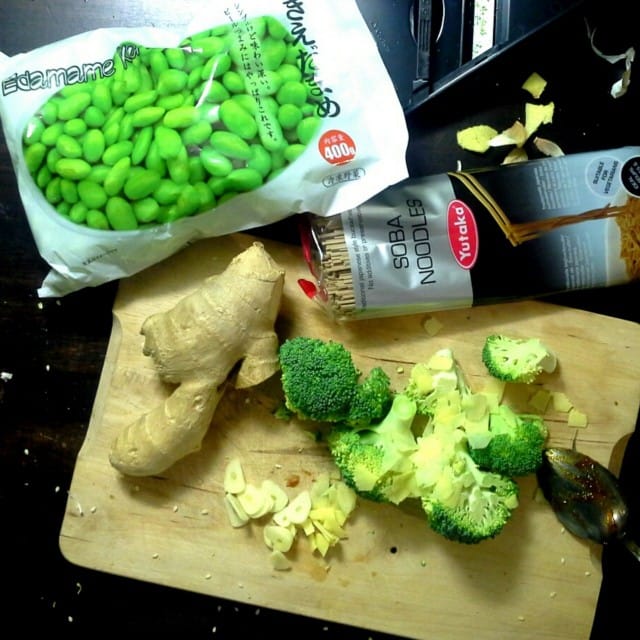 Munakoison kypsyessä keitin nipun sobanuudeleita – niissä ei mene kymmentä minuuttiakaan, ja paistoin parsakaalinnuppuja pannulla. Kun parsakaali oli puolikypsää, lisäsin pannulle silputun valkosipulinkynnen ja reilusti tuoretta ohuenohueksi mandoliinilla siivuttamaani inkivääriä. Viimeiseksi pannulle tuli pari desiä edamamea, nuudelit, loraus soijakastiketta, [url=http://bigtreefarms.com/index.php/page/product/89/167/167]kookosnektaria[/url] ja tulista chilikastiketta, Srirachaa.