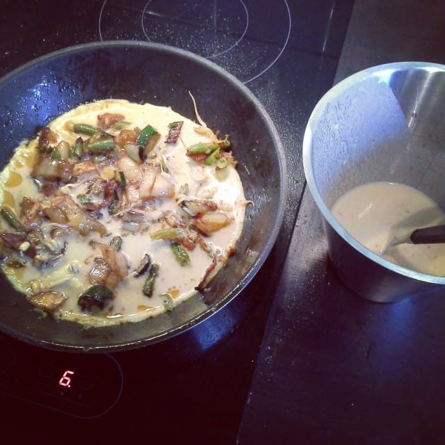 Lättyhommat kannattaa aloittaa taikinasta. Tänään tein sen mantelimaidosta, maissijauhoista (ei Maizena-tyyppinen suuruste eli maissitärkkelys, vaan ne jauhot jotka on tarkoitettu gluteenittomaan leivontaan), soija- ja kalakastikkeesta sekä kananmunasta.