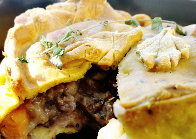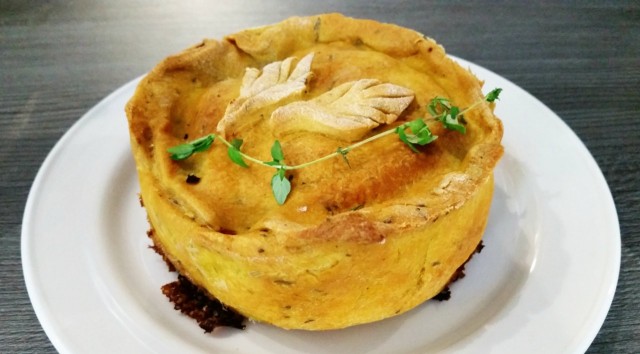 Moni on varmaan jo bongannut Karhupuiston kylkeen auenneen uuden kahvilan, Berggan? [url=http://www.facebook.com/berggakarhupuisto]Bergga[/url] tarjoilee perinteisiä kahvilatuotteita, lounasta ja … peribrittiläistä [b]LIHAPIIRAKKAA[/b]! Kyllä tämän tytön leuka loksahti, kun silmiini osui tuo herkku, jota olen ennen nähnyt vain televiissiossa. Berggan leipuri, [i]Lloyd Polack[/i], on vastuussa tästä iloisesta yllätyksestä. Perinteisen umpinaiseen taikinakuoreen leivotun liha-juures-täytteisen piirakan lisäksi tarjolla on kasvisversio. Piiras on tolkuttoman mehevä, sakea täyte maukasta ja taikinakuori täydellinen sopivaa murenevaisuutta myöten.