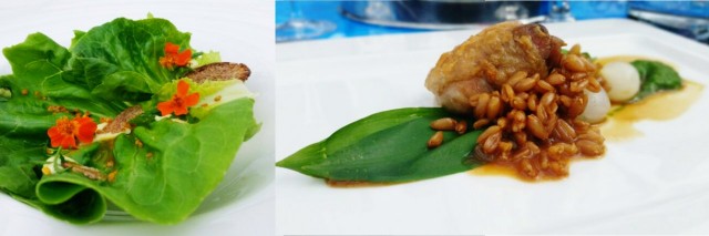 Menusta lounaallamme vastasi Filip Langhoff [url=http://restaurantask.com/]Ravintola Ask[/url]ista. Vaikkei alkupala, [i]Kesävihanneksia kehäkukkaa[/i], ehkä ollut kaikkein moniulotteisin elämässäni syömistäni annoksista, oli köykäisten salaatinlehtien ja kukkasten mutustelu tuulen tuivertaessa ympärillämme vähintäänkin jännittävää. Kilpasyönti tuulta vastaan oli hauskaa, mutta arvostan myös Langhoffin pysymistä annosvalinnassaan (häntä oli nimittäin varoiteltu yrttien ynnä muiden heiveröisten ainesosien käytöstä).
