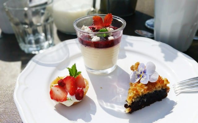 Jälkkäriksi meille, jo valmiiksi onnesta soikeille, tarjottiin kolme pikkuista makeaa: kermavaahdolla ja marjoilla täytetty pieni taikinakuppi, pieni toskakakkunen sekä panna cotta. Jokainen näistä täydellisistä pienistä herkkupaloista oli kuin taideteos.