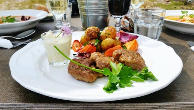 Kahvilatuotteiden lisäksi Tsarevna tarjoilee päivittäin vaihtuvaa lounasta. Valitsin lammaslihapullat tsatsikin ja salaatin kera, Ahvenanmaa kun on tunnettu lampaistaan. Huh, mikä annos! Lammaspullat olivat meheviä ja maukkaita ja niiden kaverina tarjotut paistetut uudetperunat UPEITA. Kylkeen ilmestynyt salaatti tulvi kukkia ja yrttejä, omalta pihalta tietysti.