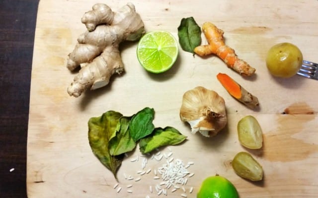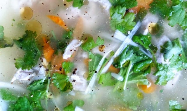 Soppani perustuu erään erittäin kirpakan kanakeiton pohjalle. Keiton nimi on [i]Ngam nguv[/i], ja se maustetaan alueelle poikkeuksellisella raaka-aineella, suolaan säilötyllä sitruunalla. Keittoon tulee myös kanaa, yrttejä ja ihanaa pähkinäiseksi paistettua valkosipulia. Omaan versiooni lisään reilusti tuoretta inkivääriä ja appelsiinia. Johan saa niin todelliset, kuin kuvitellutkin pöpöt kyytiä!