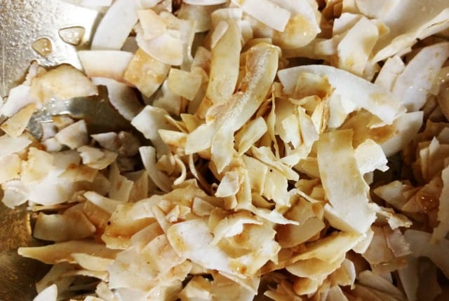 Sekoita mausteliemen ainekset keskenään ja pyörittele kookos liemessä. Anna kaiken nesteen imeytyä lastuihin. Lämmitä uuni 150 asteeseen ja levitä kookos tasaisesti leivinpaperoidulle pellille. Paista uunissa 15-20 minuuttia, tai kunnes lastut ovat kauttaaltaan ruskistuneet, mutta eivät palaneet. Lastuja on hyvä käännellä muutaman kertaa paiston aikana, jotta ne ruskistuvat tasaisesti. Säilytä ilmatiiviissä rasiassa – tosin eipä nämä kauaa säily. Ainakaan minun kotonani!