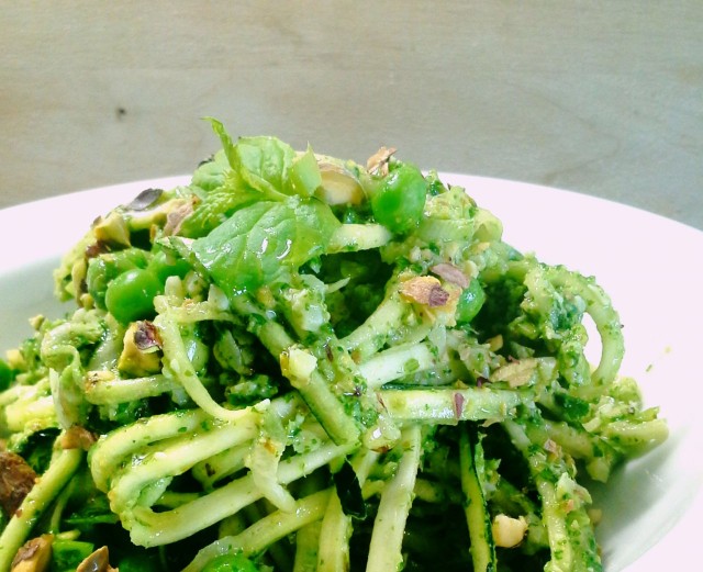 [b]Kesäkurpitsa-"pastasalaatti" pistaasipestolla (4:lle):[/b]