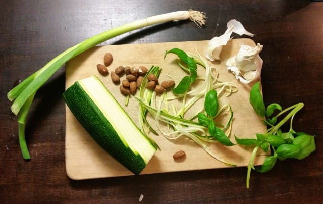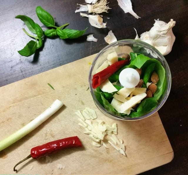 Rouhi kaikki peston ainekset vettä/kesäkurpitsan keskiosaa lukuunottamatta blenderissä, silppurissa tai sauvasekoittimella. Hätätapauksessa sakset+kuppi on ihan toimiva yhdistelmä myös! Jätä seos melko karkeaksi. Lisää hieman vettä, tai kesäkurpitsanuudeleista yli jäänyt keskiosa, ja sekoita vielä hetki, jotta saat pestosta hieman tahnamaisempaa. Itse tykkään kuitenkin jättää seoksen mahdollisimman rouheiseksi. Suolaa ei todennäköisesti tarvitse lisätä, jos käytät suolattuja manteleita.