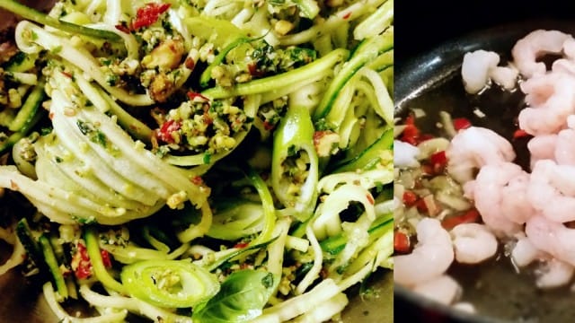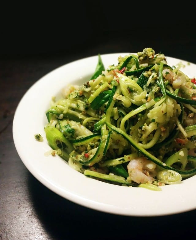 Zoodelit ovat kevyttä ja ravintorikasta sapuskaa, ja toki vihannesnuudeleiden raaka-aineeksi käy muukin raakana syötävä, koostumukseltaan nuudeliksi sopiva pötkylä kuin zucchini. Valkoretikka, porkkana ja kurkku esimerkiksi maistuisivat ainakin minulle! Eilen väsäsin kastikkeeksi pestoa savustetuista manteleista, ja paistoin vielä bonuksena maanantain kunniaksi sekaan hieman chiliä, valkosipulia ja herkkuani katkarapuja. HYVÄÄ OLI HUH HUH!
