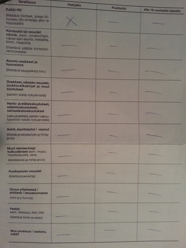 Seurasi lisäselvityspyyntö. Kuukausi oli vaihtunut, vuokrat oli maksamatta ja visa veteli viimeisiään. Lisäselvityspyynnön mukaan en ollut täyttänyt varallisuusselvitystä oikein. Ohjeesta oli yliviivattu kohta “merkitse viivalla, mikäli ei ilmoitettavia tuloja”. Vedin 32 viivaa ja lähetin varallisuuselvityksen uudelleen.