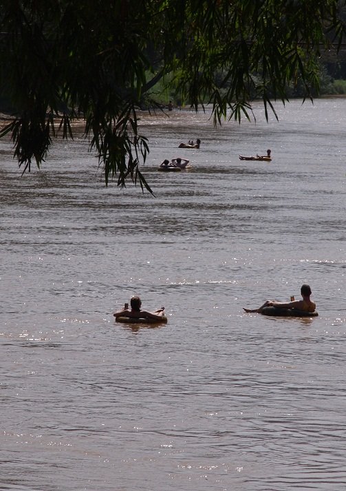 Katselen uskomattomia maisemia ja tyhjiä baareja. Alkuvuoden aikana kuoli kuusi. Se oli liikaa. Hallitus päätti sulkea joen varteen rakennetut baarit elokuun alussa. Huhujen mukaan Vang Viengin tulevaisuudesta päätetään lähiaikoina. Kellun kahden ruotsalaisen kanssa. Törmäämme etelä-afrikkalaisiin ja japanilaiseen. Muutama muu kelluu ohi. Siinä kaikki. Joki on tyhjillään. Viisi vuotta sitten meitä oli tuhat.