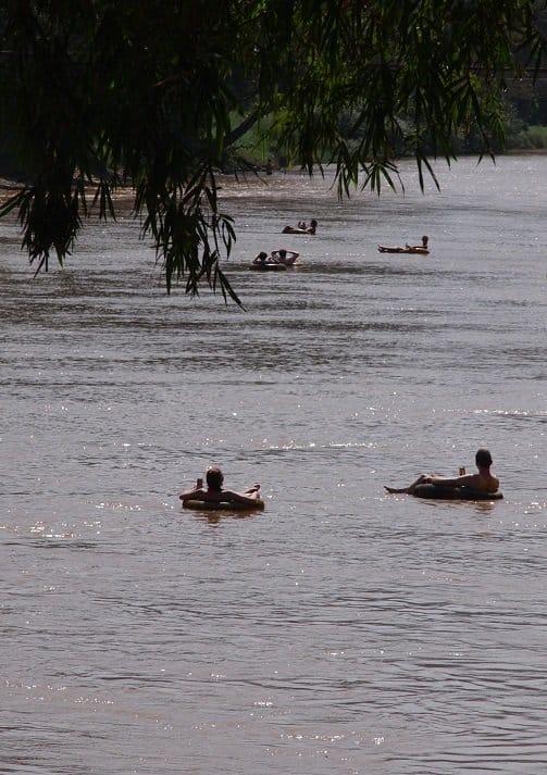Katselen uskomattomia maisemia ja tyhjiä baareja. Alkuvuoden aikana kuoli kuusi. Se oli liikaa. Hallitus päätti sulkea joen varteen rakennetut baarit elokuun alussa. Huhujen mukaan Vang Viengin tulevaisuudesta päätetään lähiaikoina. Kellun kahden ruotsalaisen kanssa. Törmäämme etelä-afrikkalaisiin ja japanilaiseen. Muutama muu kelluu ohi. Siinä kaikki. Joki on tyhjillään. Viisi vuotta sitten meitä oli tuhat.
