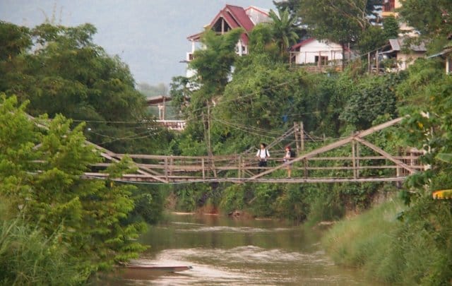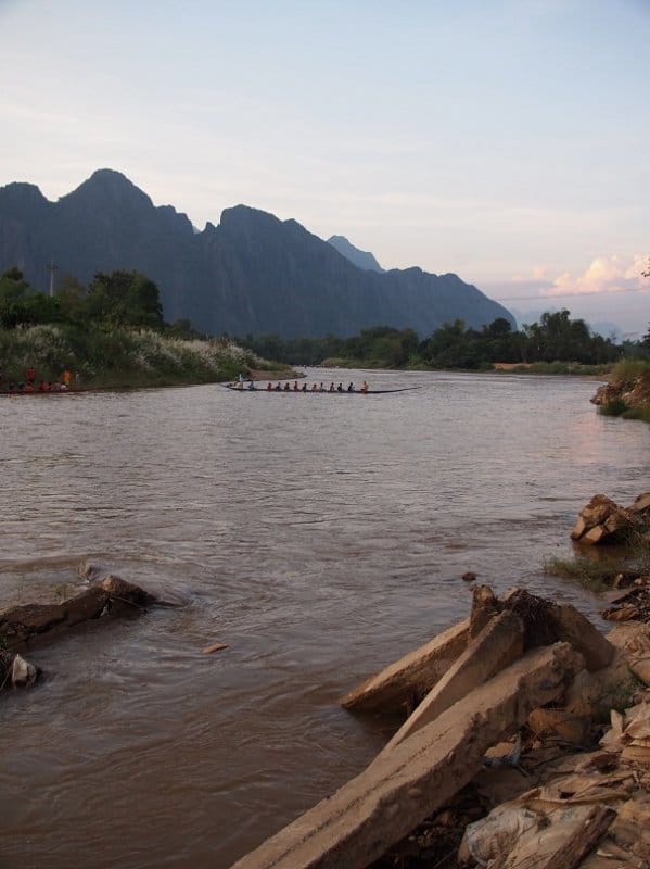 Katselen autiota jokea ja hörpin bisseä. Olemme siirtyneet joen toiseen auki olevaan baariin. Omistaja tarjoaa shotin laolaoa. Ennen tässä oli iso linko, josta humalaiset syöksyivät jokeen. Silloin oli asiakkaita. Nämä hyppyrit, lingot ja vesiliukumäet ovat se, mikä Vang Viengissä tappaa. Joessa kellumisessa ei ole mitään vaarallista, jos ei satu törmäämään kärmekseen tai harvinaisuuteen nimeltä krokotiili.