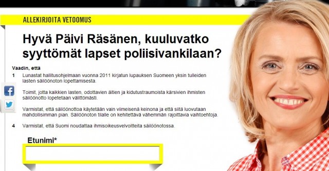 Kiitos Amnestyn painostuksen Jyrki Kataisen ensimmäisen hallituksen hallitusohjelmaan kirjattiin lupaus yksin maahan tulleiden lasten säilöönoton kieltämisestä ja säilöön ottamisen vaihtoehtojen kehittämisestä. Hallitusohjelman lupausta ei ole täytetty. Sivistysvaltiossa Suomi pitäisi olla itsestään selvää, että lapset, odottavat äidit tai kidutetut eivät kuulu poliisivankilaan. Säilöönotot kuuluvat sisäministeri Päivi Räsäsen vastuualueeseen.