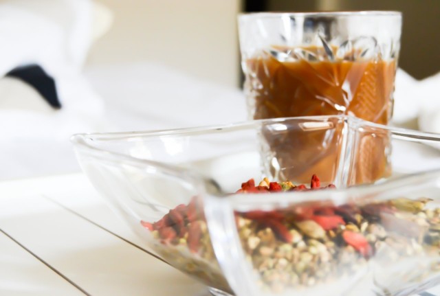 Tän sunnuntain valinta sisälsi gojimarjoja ja hamppuproteiinia. Mantelimaidolla höystettynä, luonnollisesti.