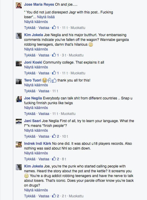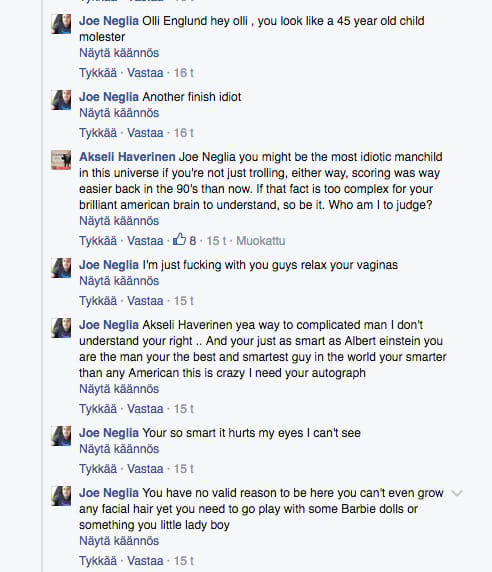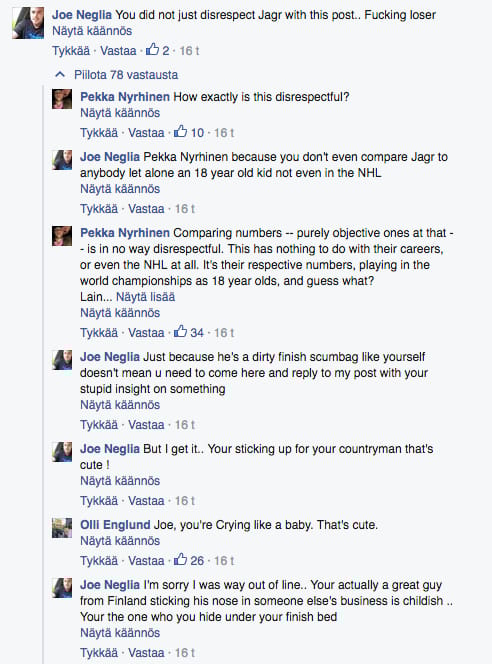 Pian ketjuun ilmestyy tyyppejä, kuten Pekka Nyrhinen, jotka kysyvät Joelta, miten faktojen kertominen on Jagrin epäkunnioittamista. Sen sijaan, että Neglialla riittäisi kyvykkyys vastata kysymykseen, hän aloittaa eeppisen henkilöön menevän dissauksen.