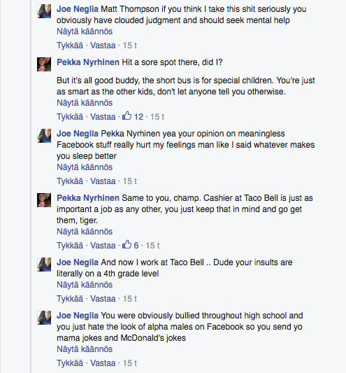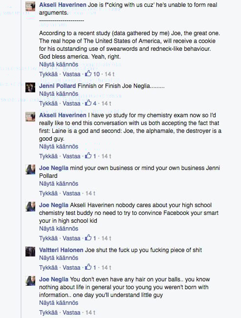 “Vain koska hän on likainen suomalaisretku, niin kuin sinäkin, se ei tarkoita, että sinun tarvitsee tulla tänne vastaamaan minun kommenttiin omalla tyhmällä näkemykselläsi”, Neglia osoittaa argumentointitaitoaan.