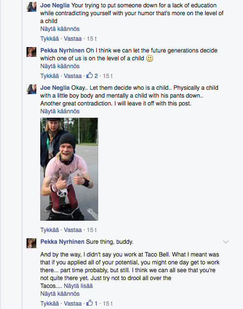 Kymmeniä viestejä myöhemmin kaveri on ehtinyt haukkua keskustelukumppaninsa iät (joko liian vanhoja tai liian nuoria), kommentoimaan heidän ulkonäköään (näytät lastenahdistelijalta tai sinulla ei varmaan kasva vielä munankarvatkaan jne.) ja sortumaan muihinkin ala-arvoisen keskustelun peruskikkoihin.