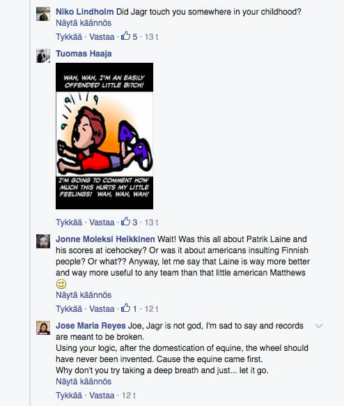 “Ethän vaan epäkunnioittanut Jagria tällä postauksella… Vitun luuseri”, Neglia kommentoi Hockey Memesin kuvaa.