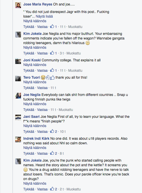 “Ethän vaan epäkunnioittanut Jagria tällä postauksella… Vitun luuseri”, Neglia kommentoi Hockey Memesin kuvaa.