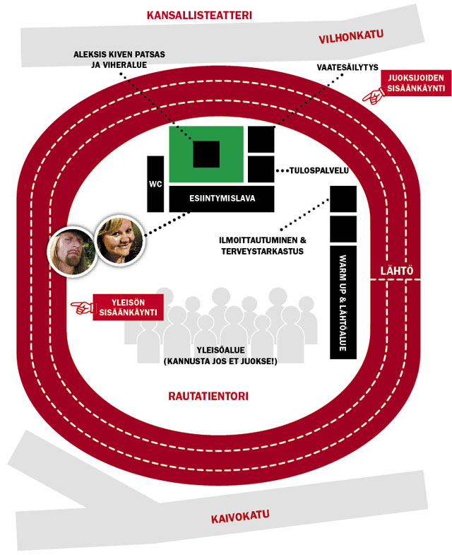 - Avoin ja ilmainen kaikille 15 vuotta täyttäneille • Ilmoittautuminen 1.9. klo 10 alkaen oheisen kartan osoittamassa paikassa • Osallistuja saa numerotarran, jonka perusteella kutsutaan lämmittelyalueelle ja testiin • Henkilökohtaiset tavarat voi ilmoittautumisen jälkeen jättää vartioituun säilytykseen • Jokaisen juoksijan terveydentila tarkastetaan ennen juoksua