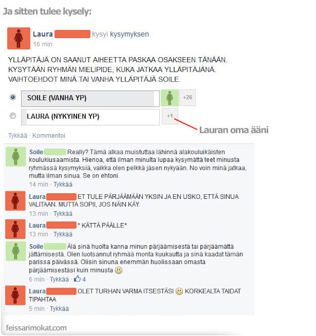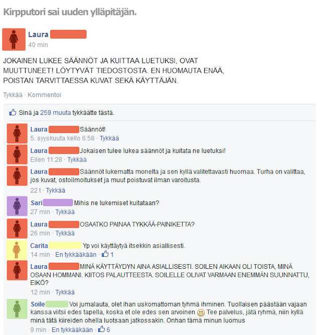 Fobba ei ehdi kaikkialle ja siksi fb-kirppikset tarvitsevat omat poliisinsa. Niiden virkaa ajavat sivustojen ylläpitäjät, jotka pitävät huolta, että keskustelu ja myyntioperaatiot sujuvat sovittujen pelisääntöjen mukaisesti. Välillä ylläpitäjää täytyy vaihtaa. Silloin saattaa syntyä konflikti, kuten tässä Feissarimokien dokumentoimassa tapauksessa.