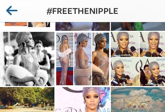 Rihannan supersuositun (ja superalastoman) Insta-tilin katoaminen on saanut fanit puuhaamaan vallankumousta: jos satojen tuhansien Instagram-käyttäjien tilit poistetaan alastomuutta sisältävien kuvien vuoksi, laskevat palvelun käyttäjämäärät dramaattisesti. Rihannakin näyttäytyi nänneineen maanantaina New Yorkissa järjestetyssä CFDA Fashion Awards -palkintogaalassa läpinäkyvässä glitterasussa ikään kuin haistatellakseen Instagramin konservatiivisuudelle.