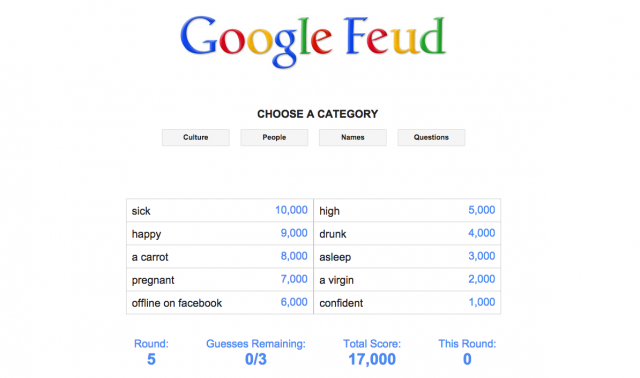 Nyt ollaan koukuttavuuden äärellä. Google Feud on uusi peli, missä pyritään arvaamaan Googlen hakutuloksille jatkoa. Oman kysymyksen voi valita pelissä neljästä eri kategoriasta, kulttuurista, ihmisistä, nimistä tai kysymyksistä.