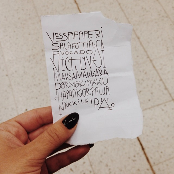 Kauppalistoja löytyy myös Instagramista hashtageilla #kauppalappu ja #kauppalista. Kuvassa oleva, kauniisti suunniteltu lista löytyi S-Marketin ostoskorista kesällä. Toimittajan bongaama lista paitsi inspiroi ostoksiin, myös päätyi Instagramiin.