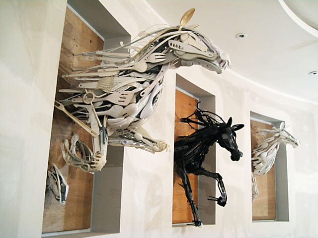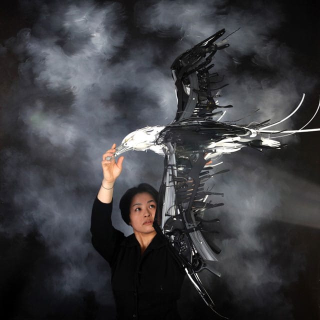 Sayaka Ganz ei heitä vanhoja muovisia keittiötarvikkeita tai muita muoviesineitä pois. Hän rakentaa niistä uskomattomia eläintaideteoksia.