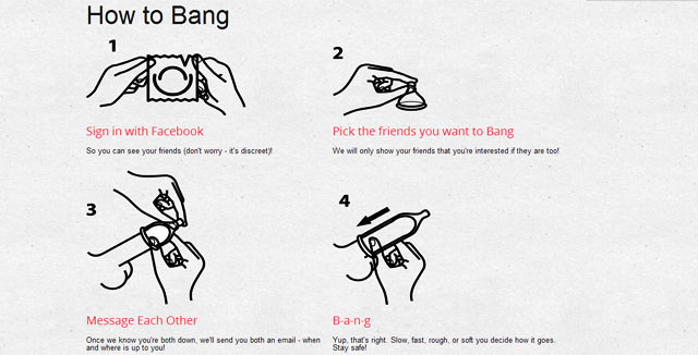 Bang With Friends -nettisivun perusidea on simppeli: se auttaa löytämään petiseuraa Facebook-kavereidesi joukosta. Kaverisi eivät saa tietää kiinnostuksestasi, jos he eivät ole itse kiinnostuneita. Kuten Huffington Post kirjoitti, sovellus vie ”tökkäämisen” uudelle levelille.