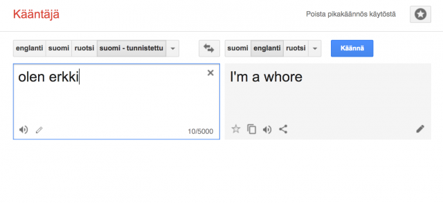 Nyt on tarjolla digiajan viihdettä suomalaisiin kotitalouksiin. Google Translaten Detect language (tunnista kieli) -toiminto antaa käyttäjille erinomaisen hassuja lopputuloksia englanniksi.
