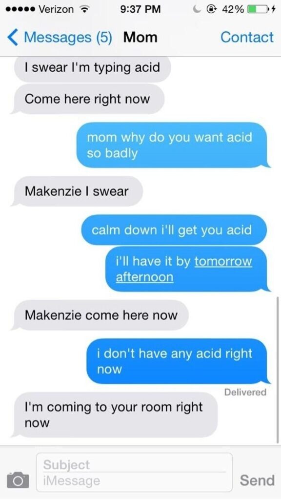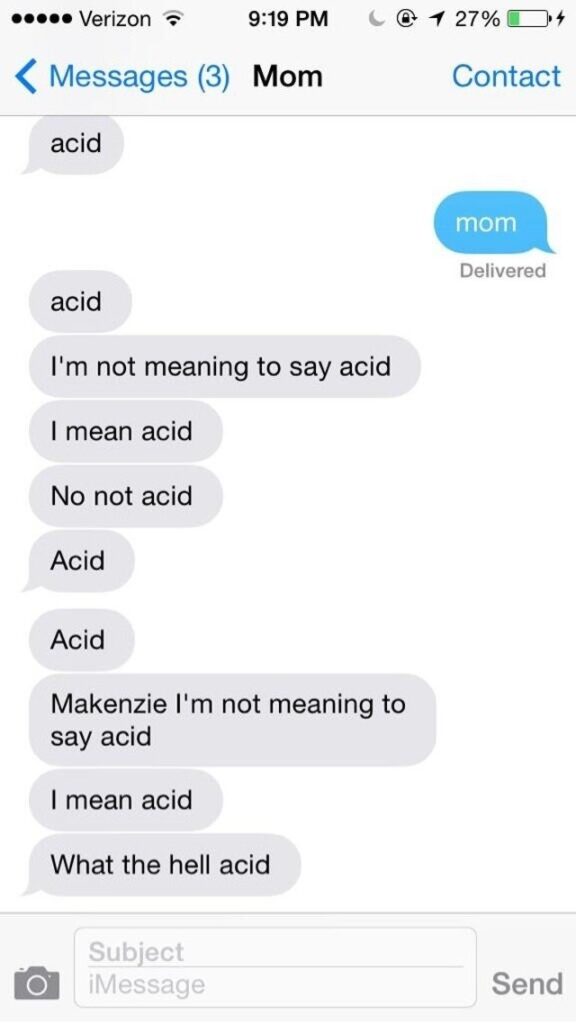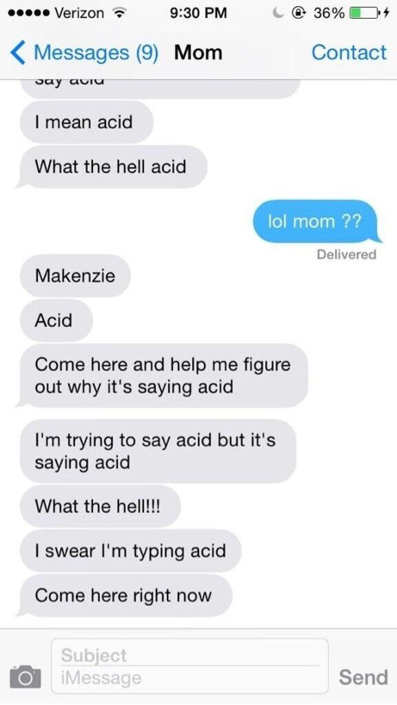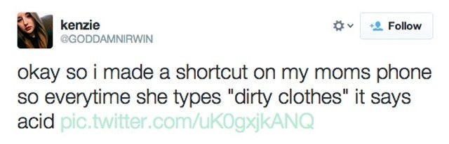 Kenzie-nimellä Twitterissä esiintyvä nuori nainen pisti äitinsä pinnan koetukselle. Hän sääti mutsin puhelimen tekstiviesti asetuksia siten, että aina kun äiti kirjoittaa ”dirty clothes” (likaiset vaatteet) puhelin korjasi tekstiksi ”acid” (happo, lsd-huumeen lempinimi). Tuloksena syntyi eeppinen tekstiviestikeskustelu.