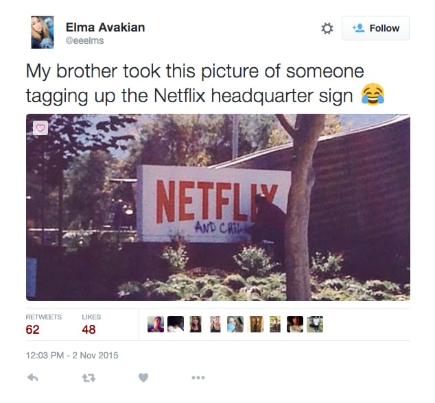 Koska internet on niin mahtava asia, joku sankari päätti tehdä meemistä todellisen tagaamalla Los Angelesissa sijaitsevan Netflixin pääkonttorin kyltin. Pieni lisäys "and chill" yhtiön logon alapuolelle sai Redditin huutonauramaan ja epäilemään jopa sen olleen tahallinen markkinointikikka. Käyttäjä nicktrvs kuitenkin kertoo, että graffiti maalattiin pois muutamien tuntien sisällä.