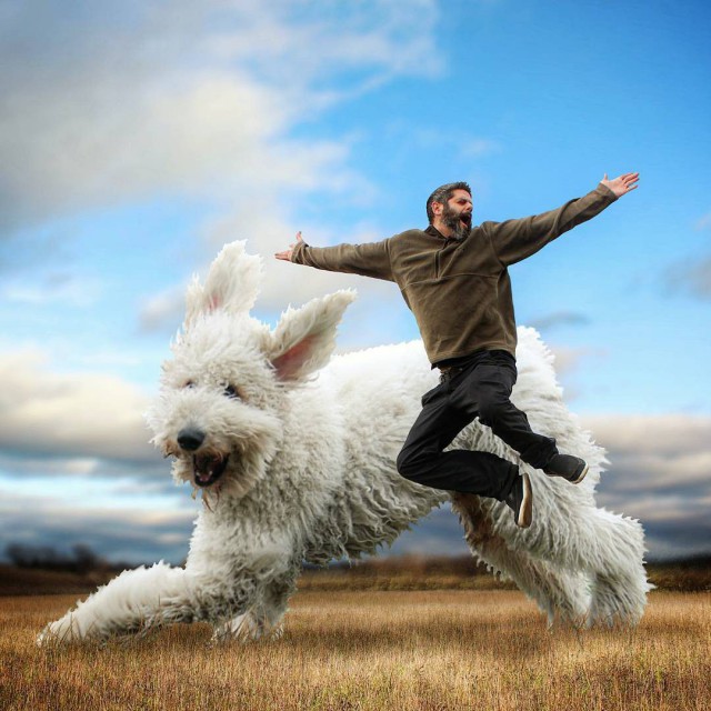 Erikoisen kuvista tekee se, että Juji on muutettu valtavan kokoiseksi. Kuvat näyttävät todella hauskalta, kun mies ratsastaa koiransa päällä ja seisoo sen rinnalla.