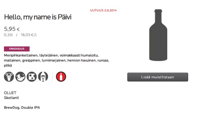 BrewDog-panimon suhde Suomeen vahvistuu. Nyt tämän uuden ystävyyden symboli, panimon Suomi-olut Hello, my name is Päivi, on löytänyt tiensä Alkon hyllylle. Kukaan ei tiedä, onko tämä ensimmäinen kerta, kun Päivi on käynyt Alkossa.
