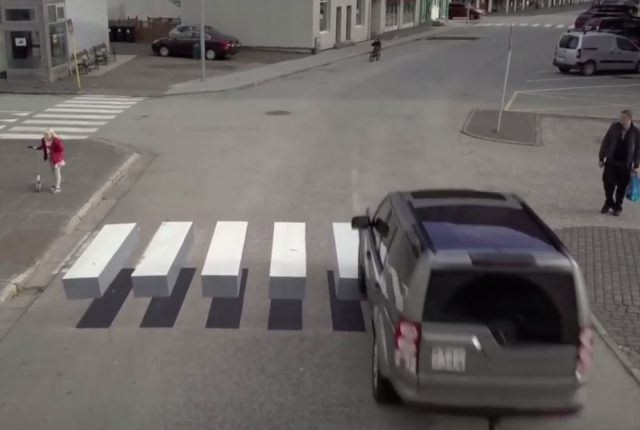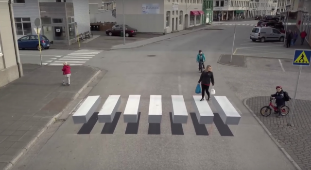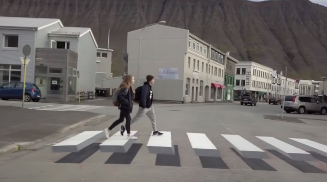 Ísafjörðurin kaupungissa Islannissa kehitettiin erottuva keino liikenneturvallisuuden edistämiseksi. Siellä suojatie sai perinteisen valkoisen maalin rinnalle mustaa maalia, jonka tuloksena suojatie synnyttää 3D-illuusion ilmassa leijuvista palkeista.