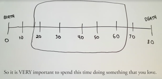 Hän piirtää koko elämänmittaiselle janalle boksin, joka kattaa työelämän. Se alkaa ennen kahtakymmentä ikävuotta ja loppuu kuudenkympin jälkeen. Visualisointi osoittaa, kuinka valtava osa elämästä työn parissa vierähtää. Niiden (vuosien) ei pitäisi olla vain “pois hoidettavia”, “perjantain odottamista”, “läpipääsemistä” tai “eläkkeen odottamista”, sanoo Unkle Adams videolla.