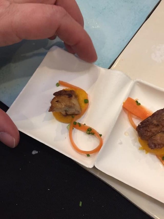 Kylmäsavuotofua, porkkanapyrettä ja pikkelöityä porkkanaa.