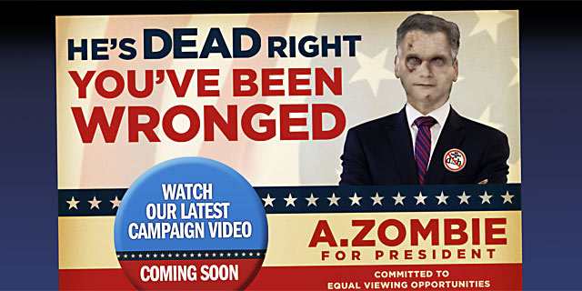 Yhdysvaltain presidentinvaalitaistoon on laahustanut yksi ehdokas lisää: A. Zombie. Hän tavoittelee tietysti äänestäjiä, joilla on aivot.